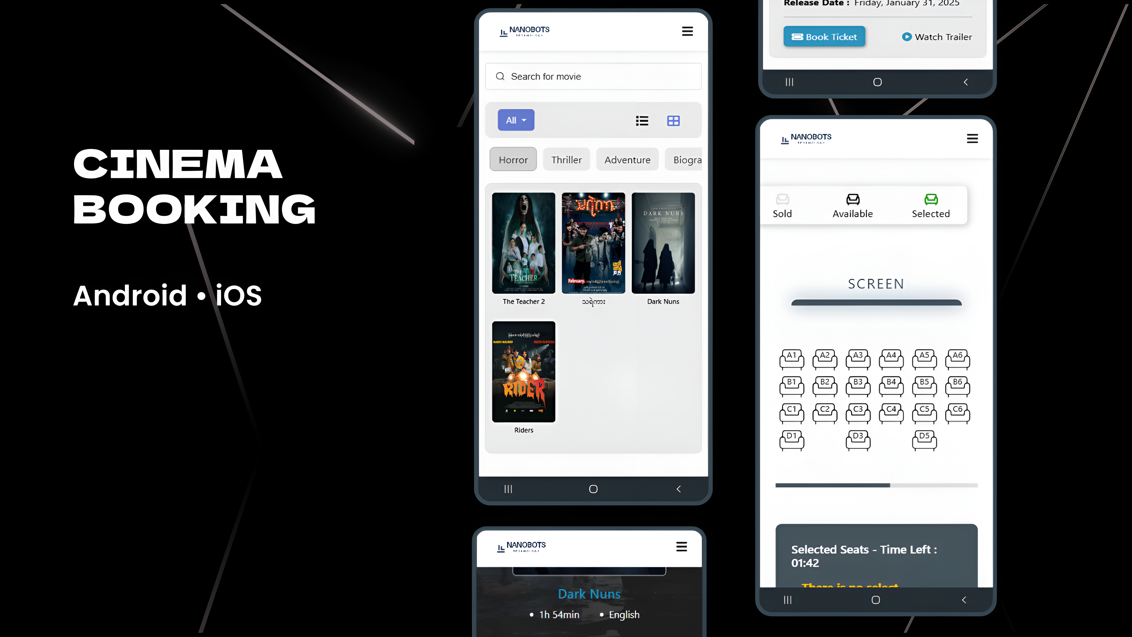 Nanobots cinema website focuses on giving customers the best experience by offering a variety of movies and comfortable seating. Customers can check available seats, book tickets, and pay securely. The website is made to be smooth and convenient so that customers can enjoy their movies without any problems.
